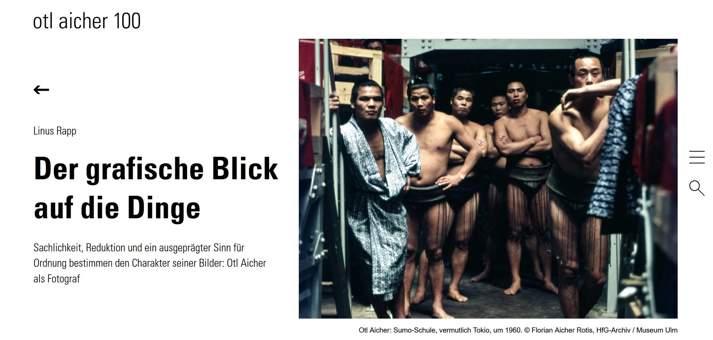 „So zeigen etwa die Porträts in der japanischen Sumo-Schule oder die der drei Frauen, die ihm abends in New York begegneten, mit welchem Einfühlungsvermögen Aicher die Fotografie im Bereich der Reportage einzusetzen wusste.”